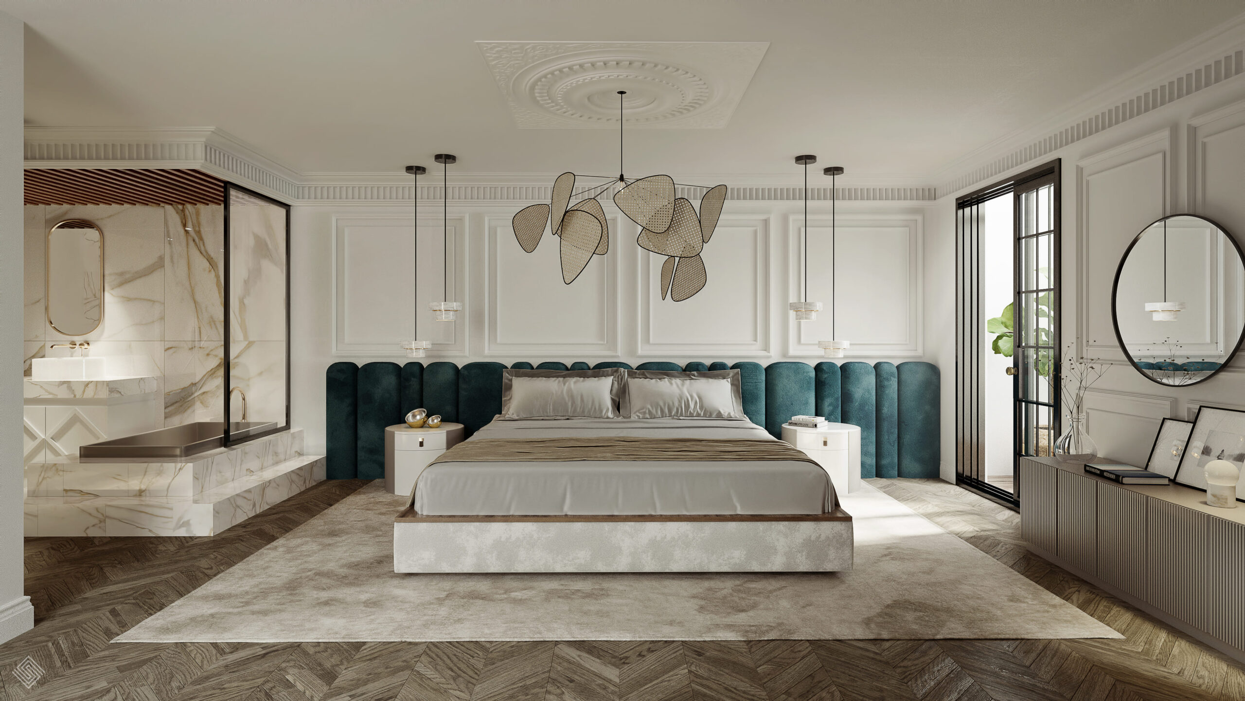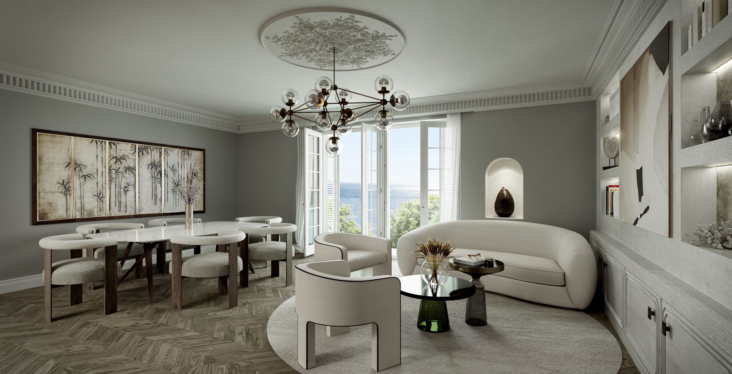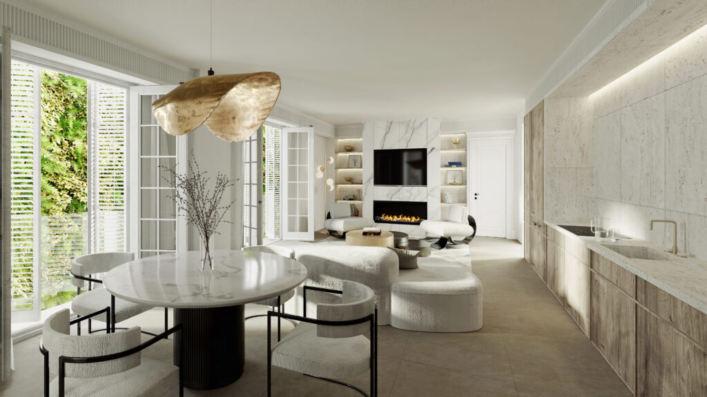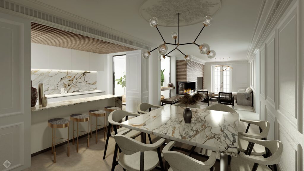 El interiorismo respeta la identidad original del edificio —molduras, proporciones y detalles ornamentales— reinterpretándolos con una mirada actual.